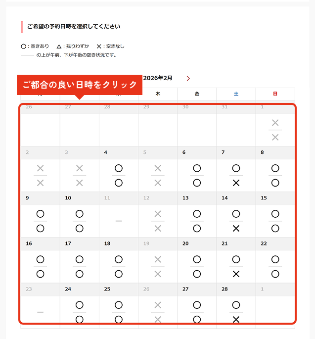 ご予約可能な⽇時には丸が表⽰されますので、いずれかをクリックします。