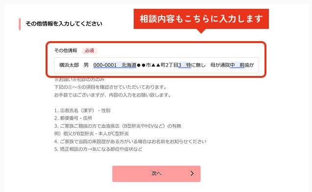 画面の指示に従って入力して進んでください。「その他情報」欄には、指定の内容のほか、ご相談内容を記載いただけます。